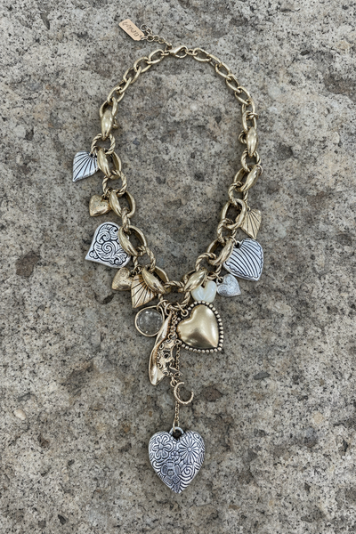 Colar arrojado em corrente grossa entrelaçada, decorado com uma coleção eclética de berloques em tons dourados e prateados. Destaca-se pelos pendentes de conchas do mar com detalhes e corações ornamentados com padrões trabalhados