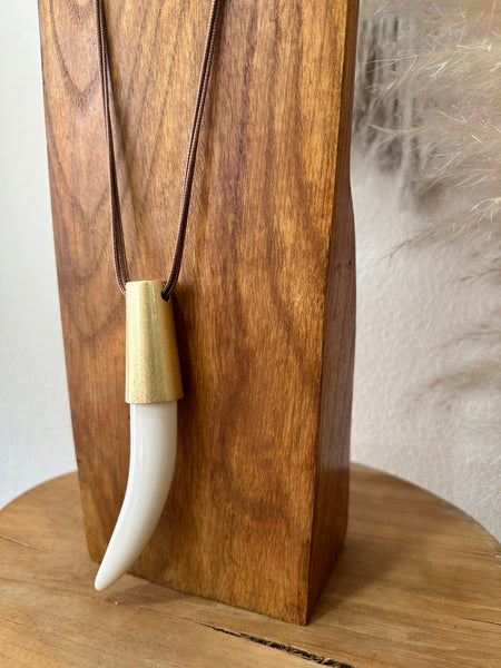 Colar comprido em cordões de algodão, com pendente em acrílico e detalhe em dourado escovado, corrente de ajuste e fecho lagosta