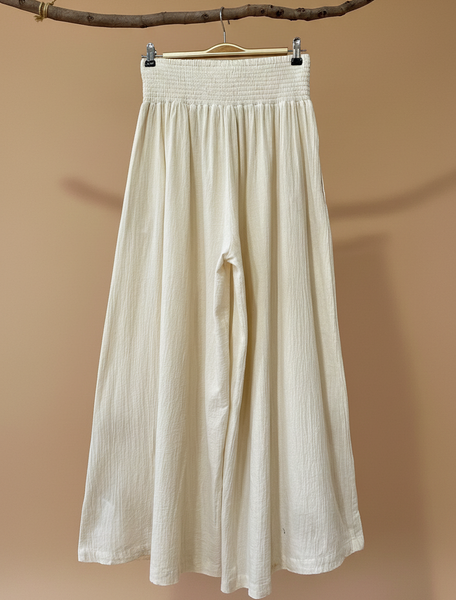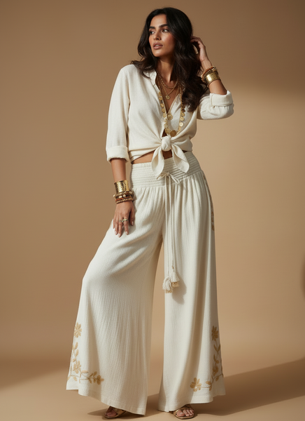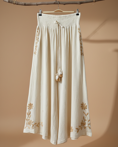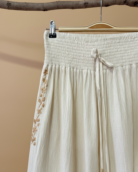 Calças palazzo em algodão cru com bordados florais artesanais feitos à mão na Índia. Cintura alta em smocking elástico com cordões decorativos e borlas com búzios, bordados florais em tons bege ao longo das bainhas e dos bolsos. Pernas amplas fluidas e comprimento longo. Peça romântica de inspiração boho que coordena com o top bordado.