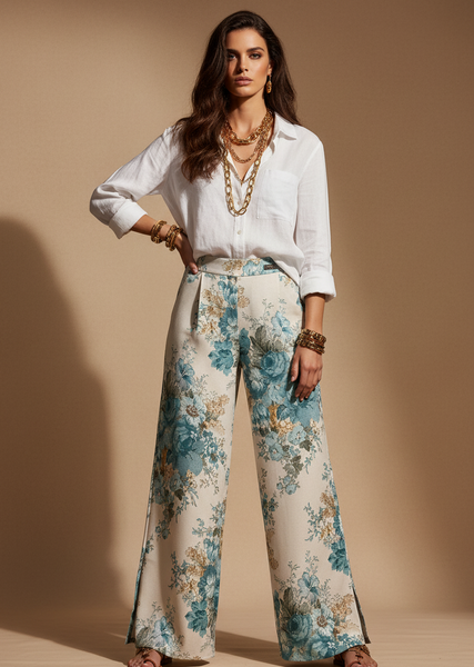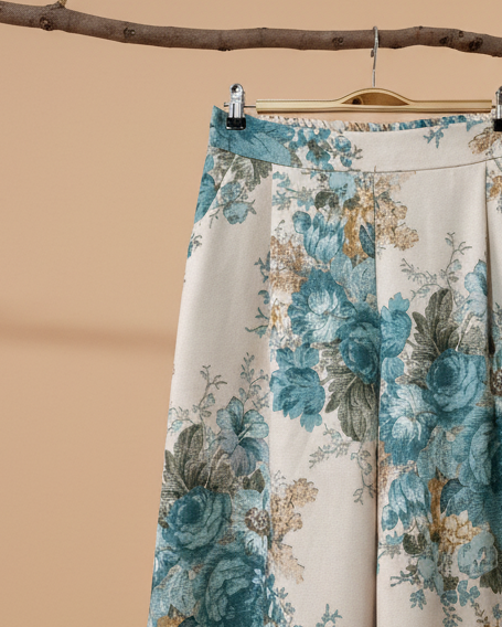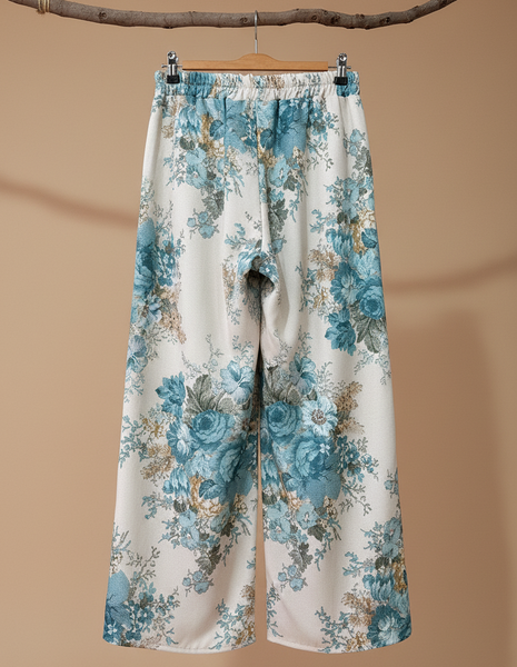 Calças fluidas de perna larga com um print floral vintage deslumbrante — rosas teal e azul sobre fundo creme, com um efeito brocado que lhes dá uma elegância atemporal. Cós duplo (plano à frente, elástico atrás)
