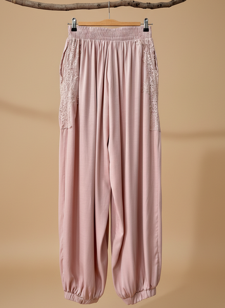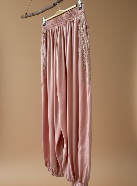 Calças PENELOPE tipo bombacha em tecido acetinado rosa antigo. Cintura elástica franzida, pernas amplas e fluidas com painéis laterais em renda floral delicada, tornozelos franzidos. Corte palazzo romântico e confortável.