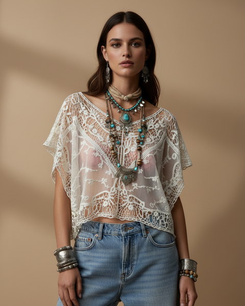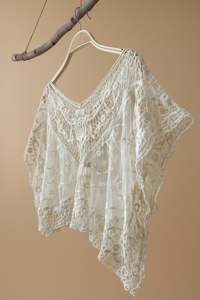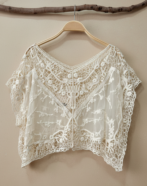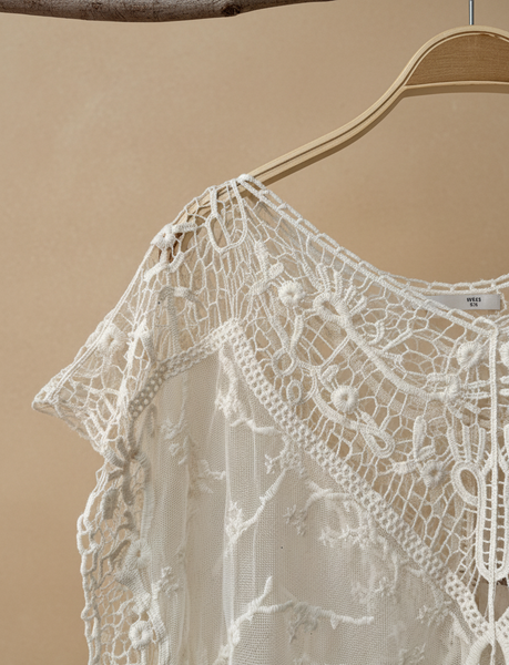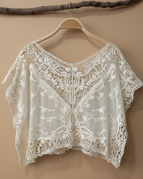 Poncho MAEVE curto em renda e tule com bordados florais em crochet. Peça em tons marfim com padrões rendilhados intrincados, decote em V com acabamentos em crochet e bainhas onduladas. Corte amplo, cropped e romântico, ideal para sobreposições.