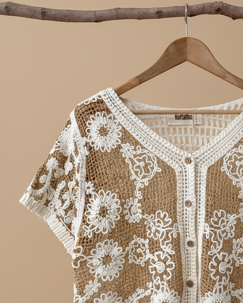 Casaco cropped de manga curta com um trabalho estilo artesanal - base em crochet aberto em tom camel, com apliques florais bordados em branco que cobrem a frente e as mangas. O contraste entre o crochet rendado das costas e o bordado rico da frente torna esta peça verdadeiramente especial. Perfeita para os dias quentes, sobre um top ou biquíni. Uma peça com alma boho.