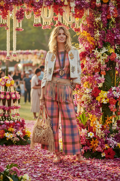 Casaco curto em algodão rústico natural com bordados florais vibrantes feitos à mão em tons de laranja, amarelo, turquesa e vermelho. Forro interior em tecido às riscas. Peça única de inspiração boho-chic. Manufaturado na Índia