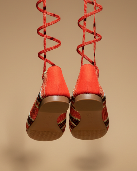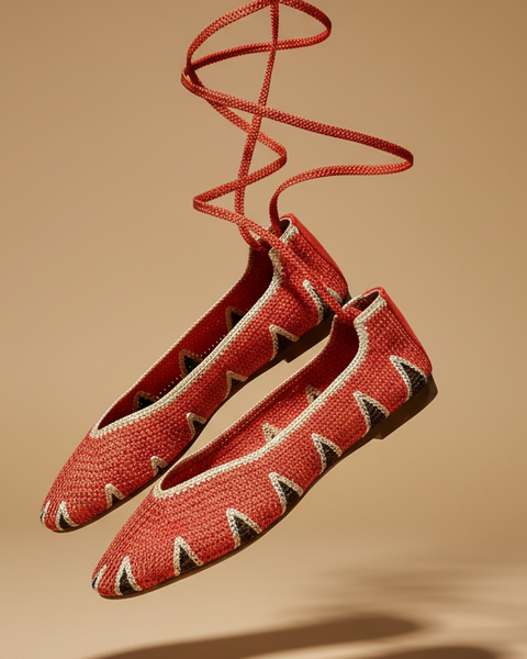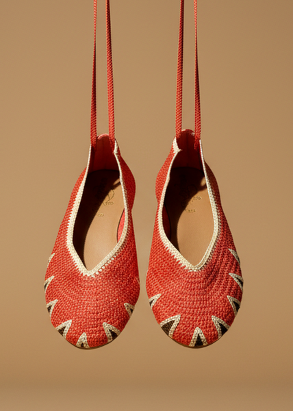 Sabrinas em crochet coral vibrante com detalhes em amarelo manteiga e castanho, com tiras longas para atar à perna estilo bailarina. Design boho-chic com padrão geométrico em ziguezague, perfeitas para adicionar um toque de cor e personalidade ao look.