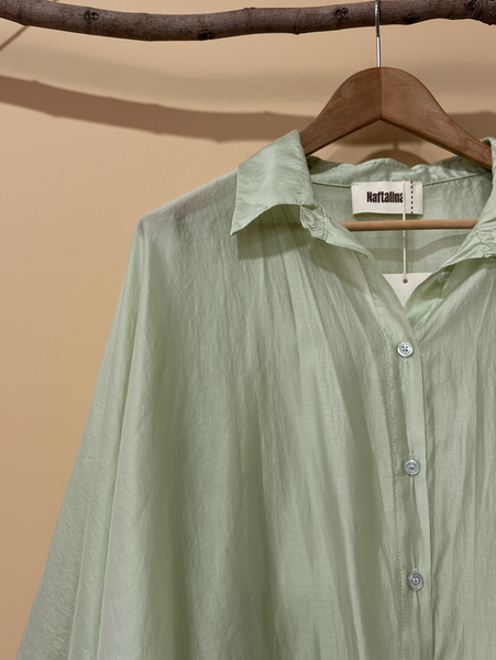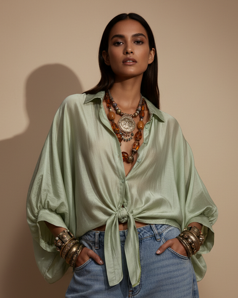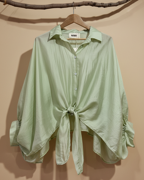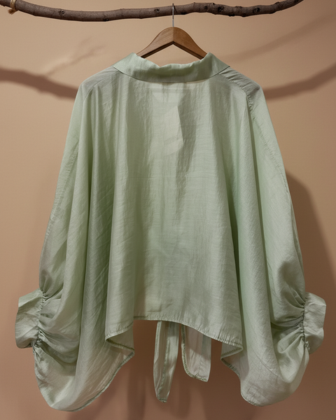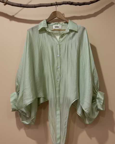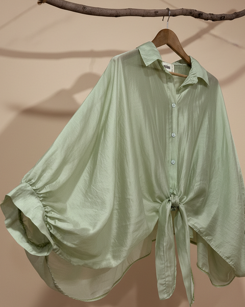 Camisa oversized em tecido fluido com gola clássica e fecho de botões. Mangas morcego em balão com punhos e detalhe de laço ajustável na frente que permite criar diferentes looks. Corte amplo e assimétrico. Peça versátil em tom suave e refrescante, perfeita para um estilo descontraído e elegante.