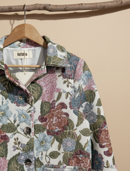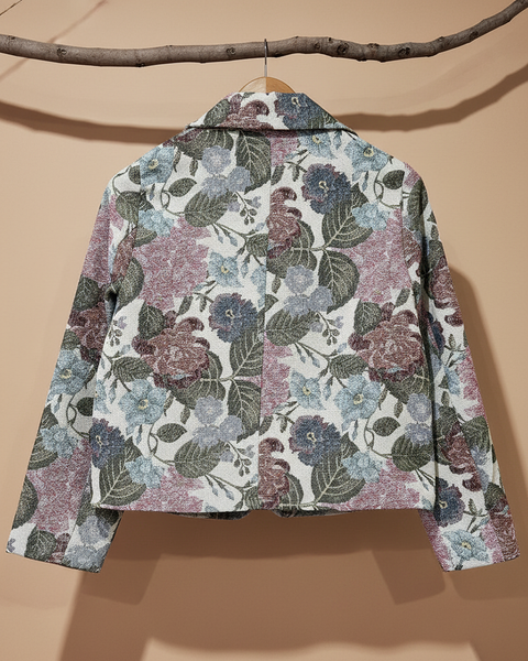 Casaco curto em tecido jacquard com padrão floral em tons de rosa, azul e verde sobre fundo claro. Corte estruturado com gola clássica, botões frontais e mangas compridas. Acabamento texturizado que realça o desenho botânico, ideal para um look boho-chic sofisticado.