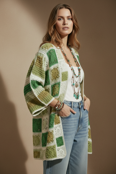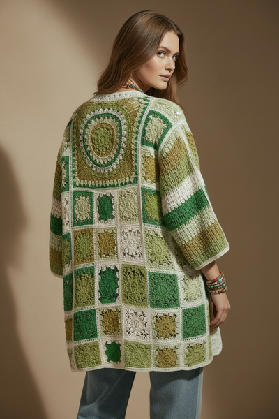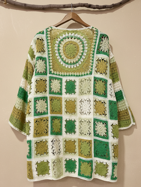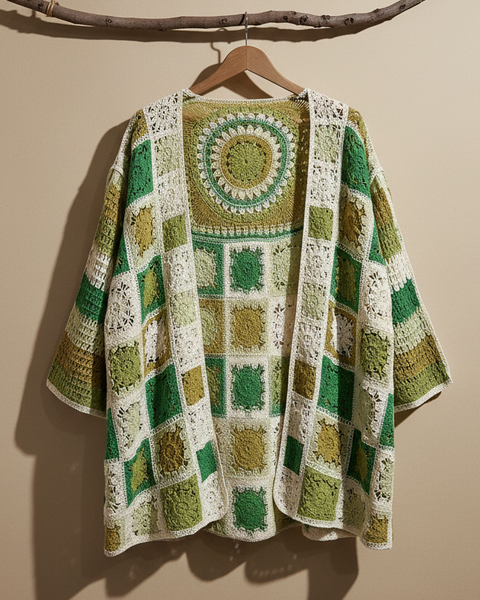 Kimono em crochet com técnica de granny squares em tons de verde, creme e mostarda. Destaque para a grande mandala circular nas costas com padrão concêntrico em degradé de verdes. Corte amplo e fluido com mangas três quartos, perfeito para sobrepor em looks boho-chic. Peça que combina tradição artesanal com estilo contemporâneo descontraído.