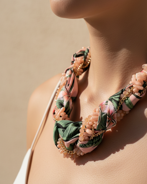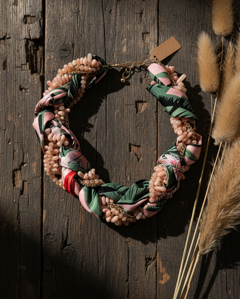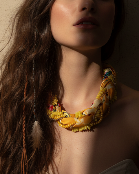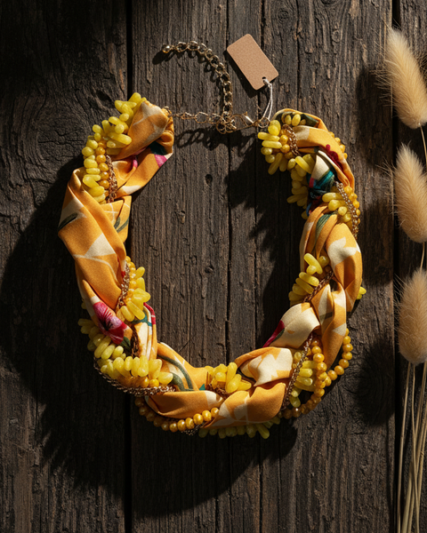 Colar statement boho-chic com design entrelaçado que combina contas em tons pastel com fitas de tecido estampado e delicados detalhes em corrente dourada. Disponível em duas variantes: amarelo com padrão geométrico e rosa coral com estampa floral tropical. Peça artesanal versátil que adiciona um toque boémio sofisticado a qualquer look.