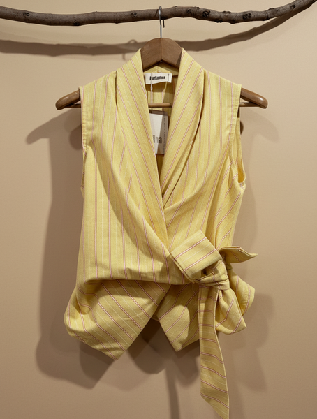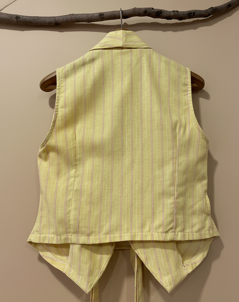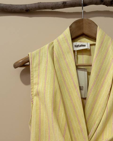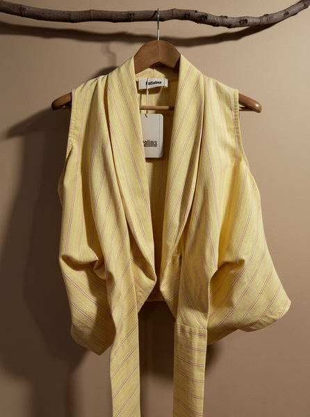 Colete transversal em tecido de algodão com riscas finas, decote envolvente e laço ajustável na cintura. Peça versátil que pode ser usada aberta como colete, traçada ou fechada com o laço para criar diferentes looks. Sem mangas, corte assimétrico nas costas com acabamento em bicos. Estilo boho-chic perfeito para compor conjuntos elegantes e descontraídos.