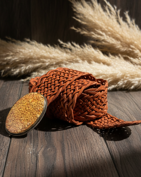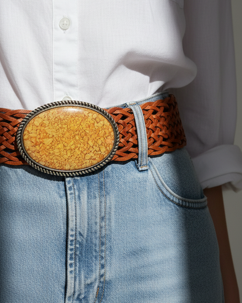 Cinto statement largo em pele genuína entrançada artesanalmente (110cm x 7cm) com fivela oval de grande dimensão em metal prateado. A fivela apresenta um cabochão em resina com pequenas pedras naturais amarela triturada com textura orgânica e variações naturais, emoldurado por corda metálica prateada. Textura rica e acabamento artesanal sofisticado. Disponível em duas cores vibrantes: mostarda e laranja escuro/terracota. Peça versátil que adiciona um toque boho-chic colorido e autêntico a qualquer look, perfeito para usar com calças de cintura subida ou vestidos.