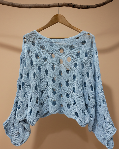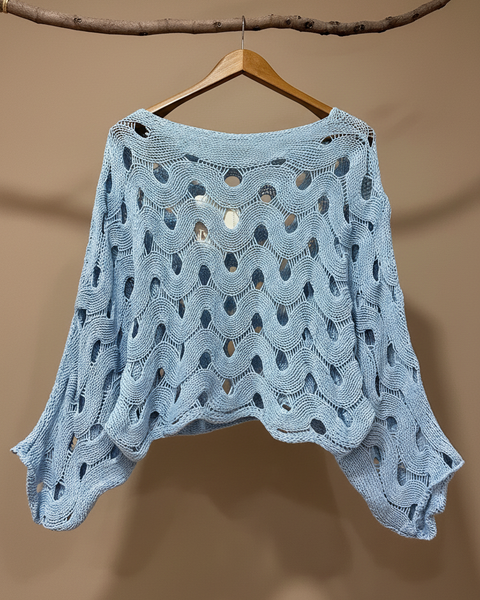 Camisola azul de malha vazada - vista frontal com padrão circular