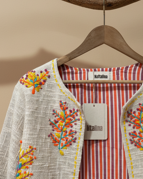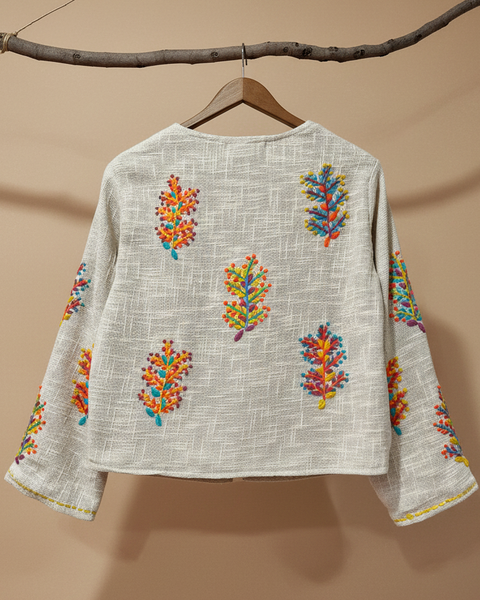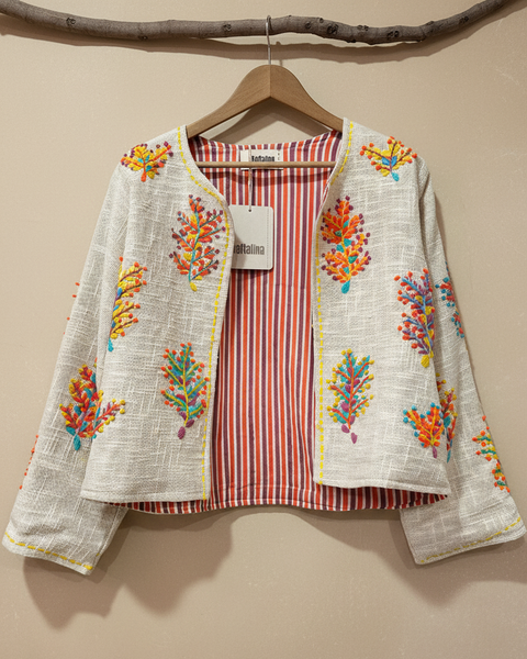 Casaco curto em algodão rústico natural com bordados florais vibrantes feitos à mão em tons de laranja, amarelo, turquesa e vermelho. Forro interior em tecido às riscas. Peça única de inspiração boho-chic. Manufaturado na Índia