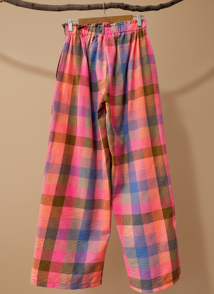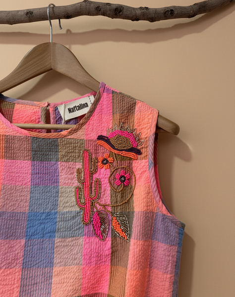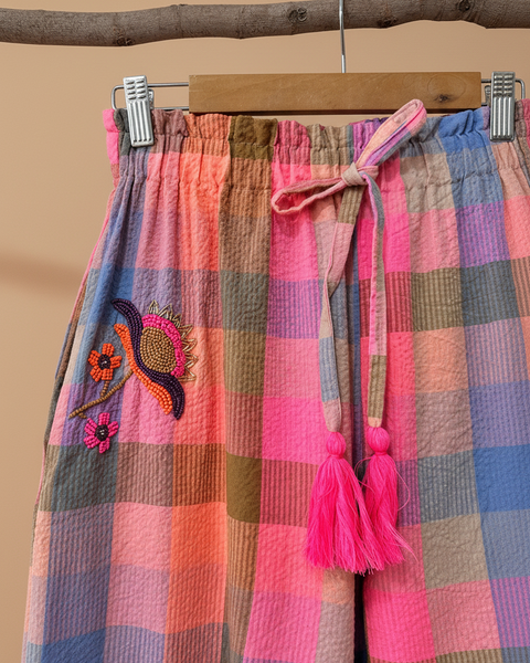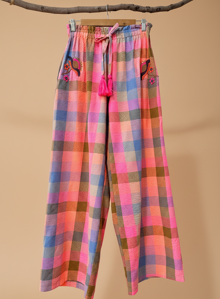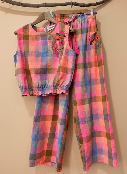 Conjunto vibrante em tons de rosa, azul e castanho com padrão xadrez texturizado. O top sem mangas apresenta bordados florais delicados e acabamento franzido na base, enquanto as pantalonas de cintura elástica oferecem conforto e estilo boho-chic. Perfeito para um look descontraído e cheio de personalidade.