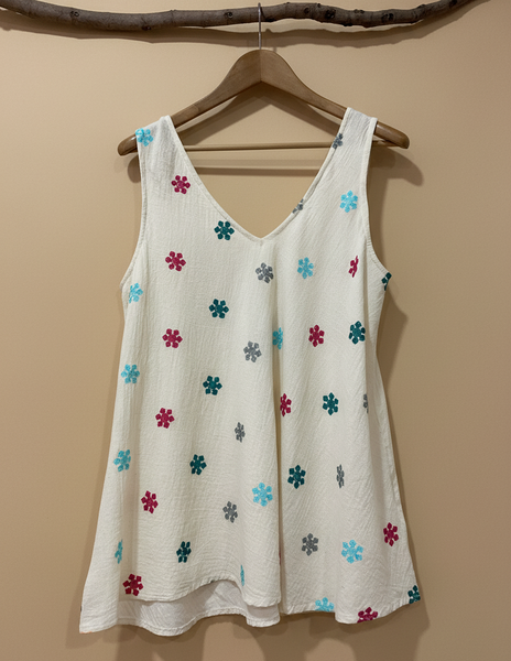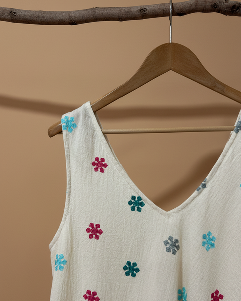 Top em algodão cru com delicados bordados florais coloridos em tons de turquesa, rosa, verde e cinza. Corte em viés com decote em V, alças largas e acabamento fluido. Peça versátil e boho-chic, perfeita para looks descontraídos de verão.