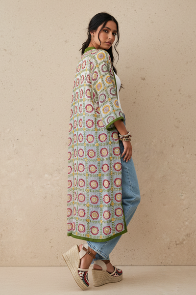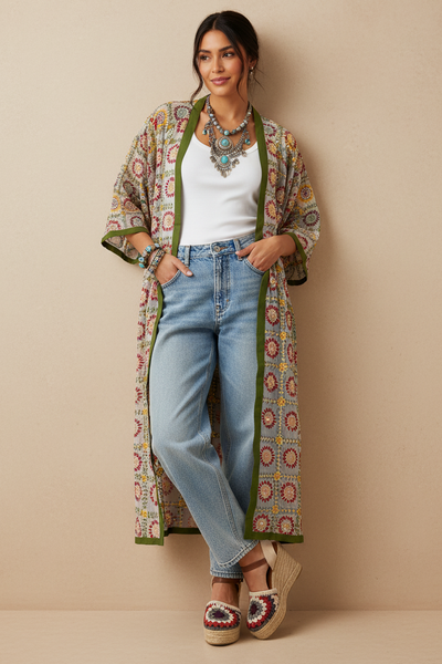 Modelo Naftalina — kimono bordado + espadrilles costas