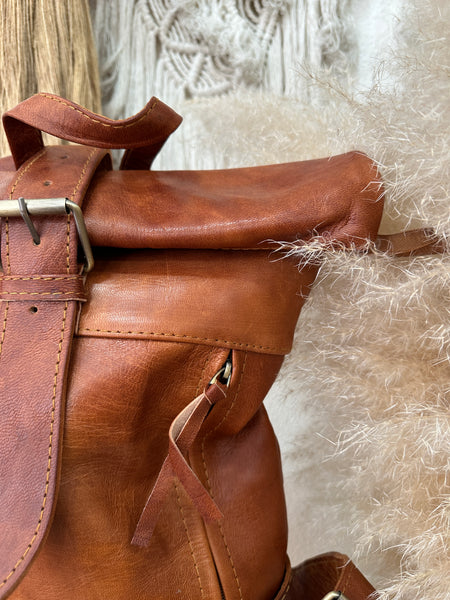 Mochila em pele com fivela e com fecho, alças reguláveis, forrada