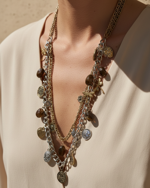 Colar comprido statement de 50cm em aço inoxidável com dupla corrente mista dourada e prateada, decorado com charms ornamentados incluindo moedas gravadas, libélulas, quartzo fumado e medalhões decorativos. Peça boho-luxe com fecho e corrente de ajuste, de estética tribal contemporânea.