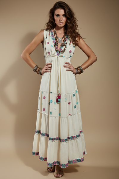 Maravilhoso vestido comprido em algodão natural com decote em V e detalhes bordados em tons vibrantes de rosa, turquesa e verde. Saia em camadas com folhos, cintura elástica e bolsos laterais. Acabamentos com pompons decorativos. Peça romântica e versátil de inspiração boho.