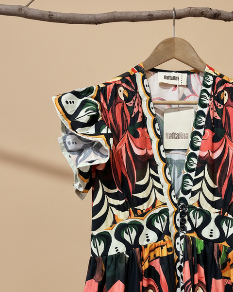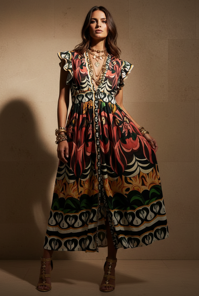 Vestido comprido em tecido de algodão com print gráfico bold em faixas horizontais. Padrão tropical vibrante com flamingos coral/rosa, riscas zebra preto/creme, sol amarelo/laranja, folhas verdes tropicais e penas de pavão geométricas preto/branco/laranja. Decote em V, mangas curtas em folho, botões frontais, cintura império franzida, com elástico nas costas. Silhueta romântica e fluida. Peça statement de inspiração tropical-maximalista com atitude ousada.