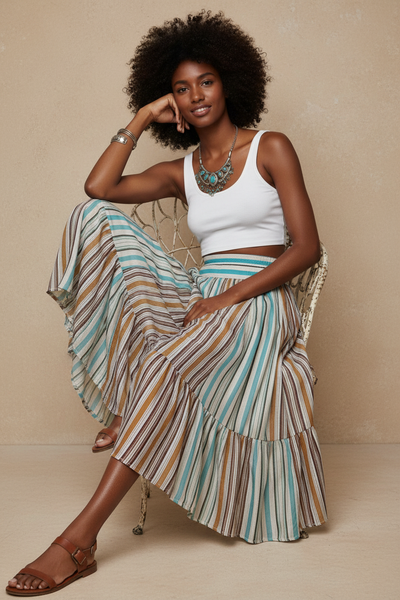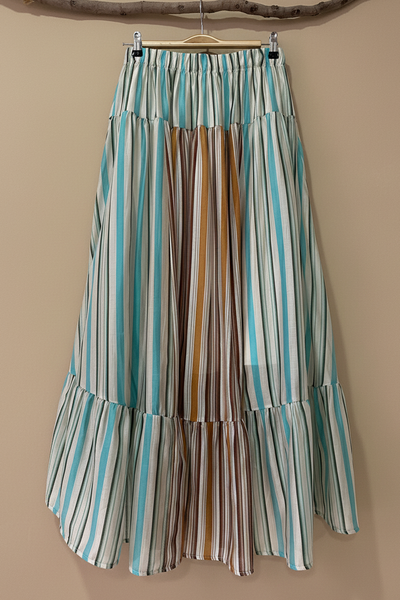 Saia forrada em tecido leve e fluido com riscas verticais multicolor em turquesa, camel, castanho e branco. Cintura elástica confortável com riscas mais largas em turquesa. O corpo da saia tem um painel central em tons castanho/camel que contrasta com os lados mais claros, criando um efeito visual único. Corte assimétrico com bainha irregular e folho na orla — mais comprida atrás, mais curta à frente. Movimento suave e natural a cada passo.