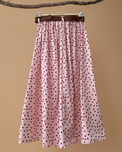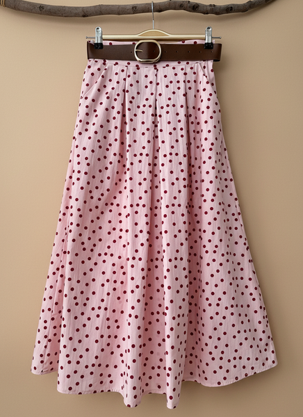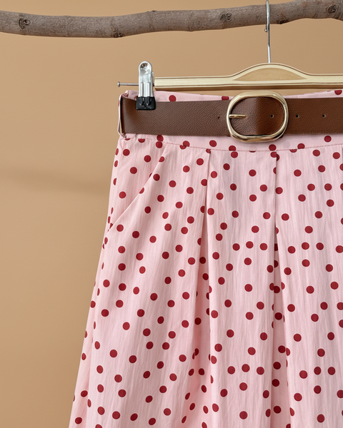 Saia midi rosa às bolinhas vermelhas/bordeaux em algodão, com cintura elástica ajustável, bolsos laterais e cinto castanho incluído. Romântica e versátil, perfeita para looks femininos.