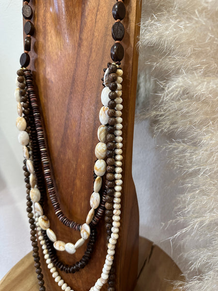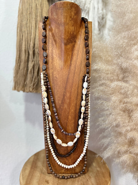 Colar comprido multivoltas em madeira e em acrílico, fecho ajustável