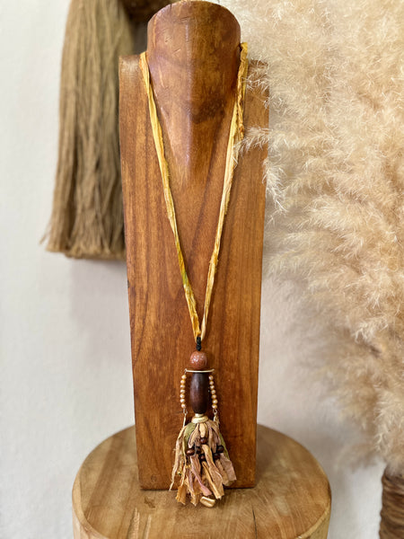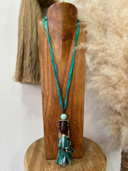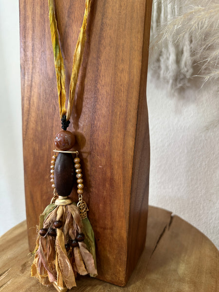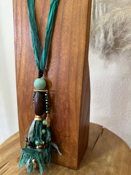 Colar comprido de atar em seda indiana reciclado, com detalhes em madeira e em acrílico