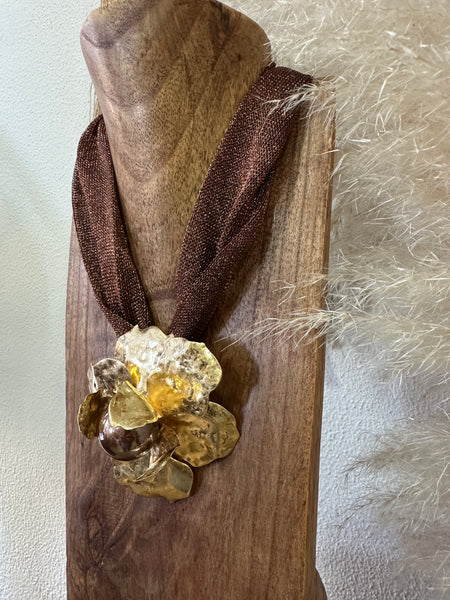 Colar curto em malha com brilho e medalhão em dourado, fecho em iman