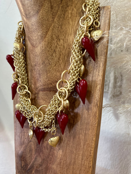 Colar curto em malha de aço dourado, com corrente e detalhes em acrílico e em dourado, corrente de ajuste e fecho lagosta