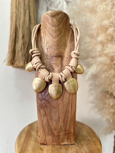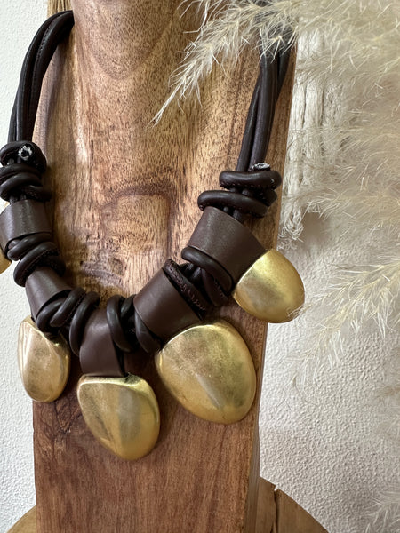 Colar curto em ecopele, com detalhes em dourado escovado. Corrente de ajuste e fecho lagosta