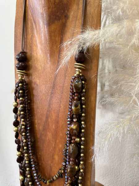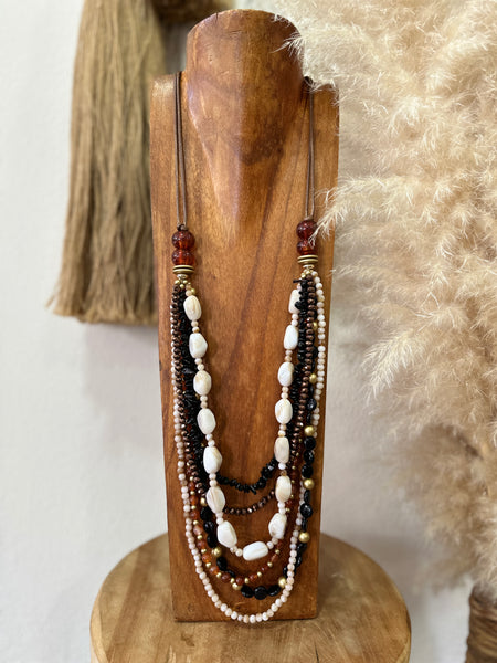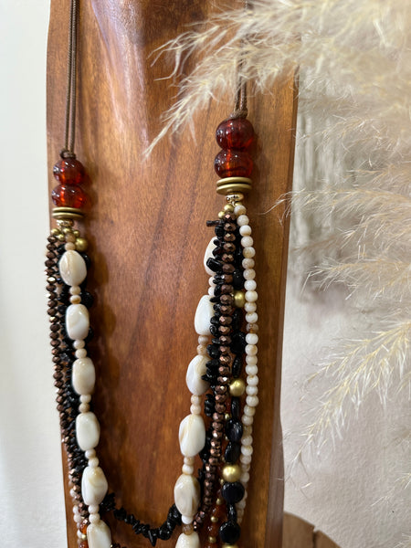 Colar multivoltas comprido, em cordão de algodão, com peças em acrílico e detalhes em dourado, corrente de ajuste e fecho lagosta