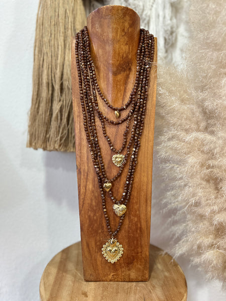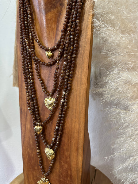 Cola multivoltas em acrílico, com detalhes em dourado, corrente de ajuste e fecho lagosta
