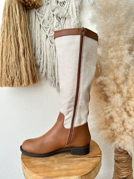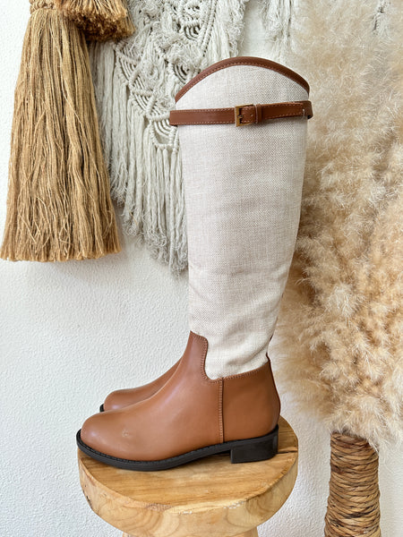 Botas em poli pele, com o cano forrado a linho, fecho lateral