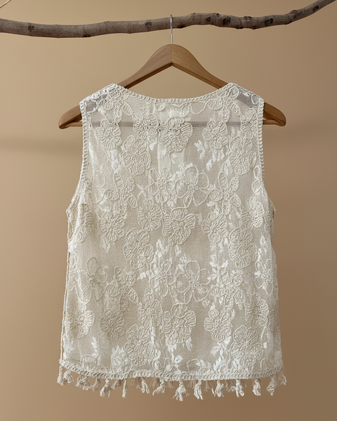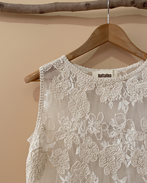 Top cropped sem mangas em renda floral creme — delicado, feminino e com aquele toque boho que é a essência da Naftalina. O padrão floral bordado cobre toda a peça, o decote redondo tem acabamento em crochet e a bainha termina em pompons/franjas que lhe dão movimento e personalidade. Perfeito para os dias quentes, sobre um bralette ou com calças baggy.