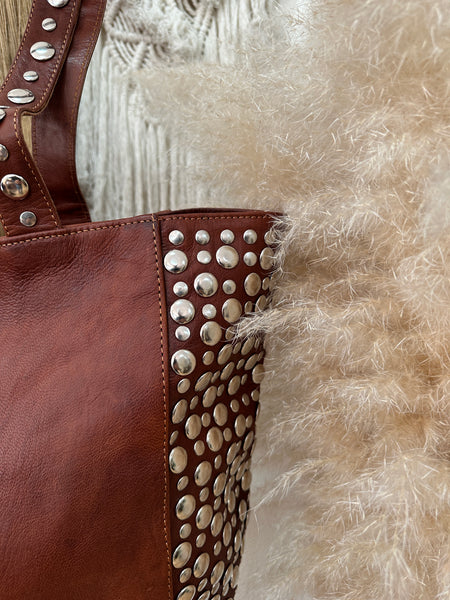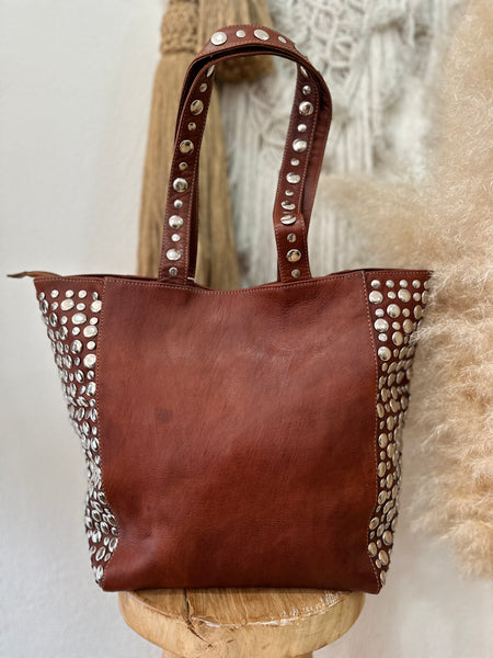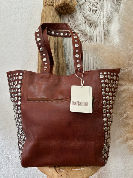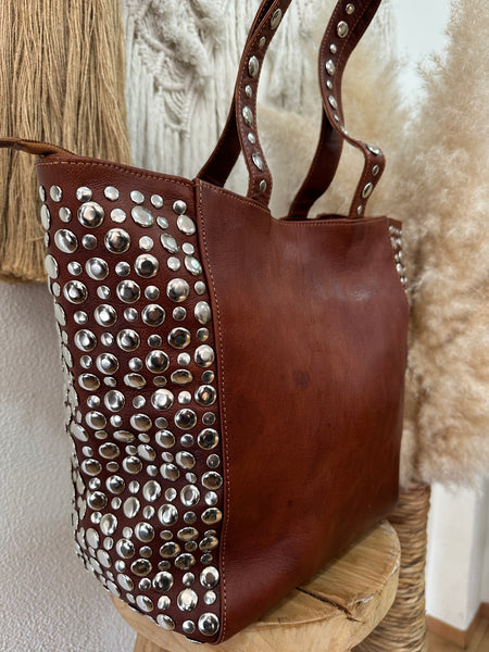 Mala em pele, com alça de ombro e aplicação de tachas, forrada e com fecho
