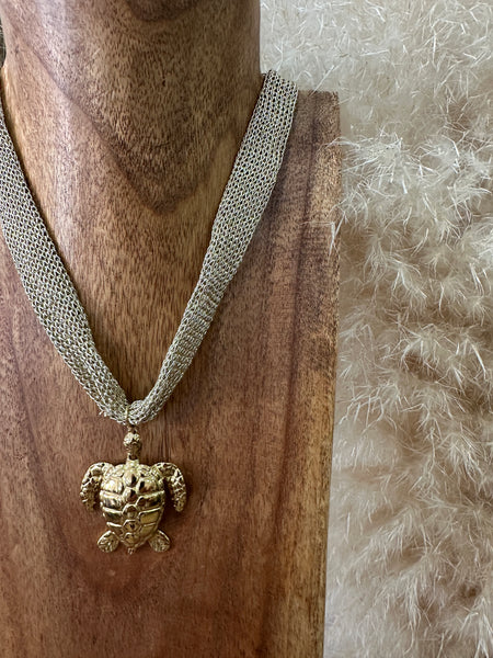 Colar curto em malha dourada, medalhão em aço dourado, corrente de ajuste e fecho lagosta
