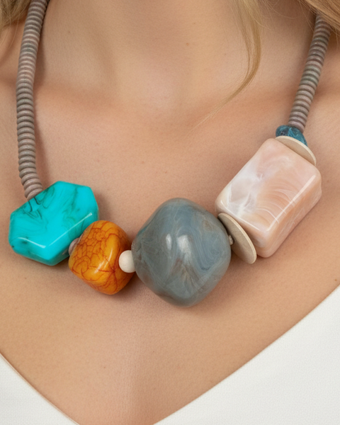 Colar statement em corrente grossa cinza com mix de peças em acrílico em tons vibrantes: turquesa bruta, âmbar laranja texturizado, ágata cinza polida e quartzo rosa translúcido. Design bold e orgânico que celebra a beleza natural das peças, perfeito para quem procura uma peça única e artesanal com energia terrestre e estilo boho-chic contemporâneo.