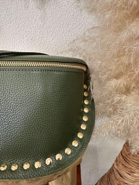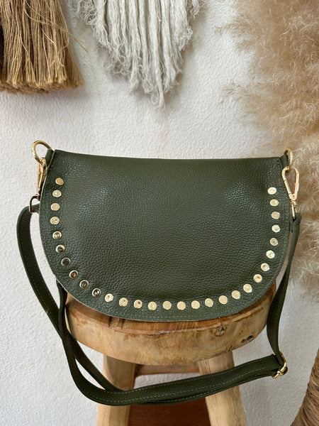 Bolsa crossbody em pele com tachas, alça regulavel e amovível, forrada e com fecho