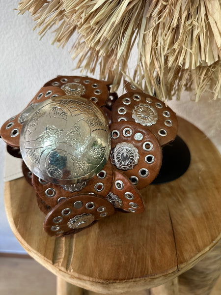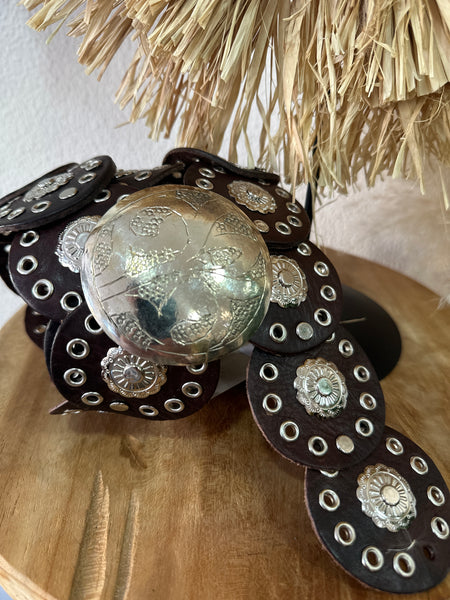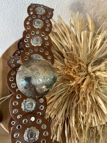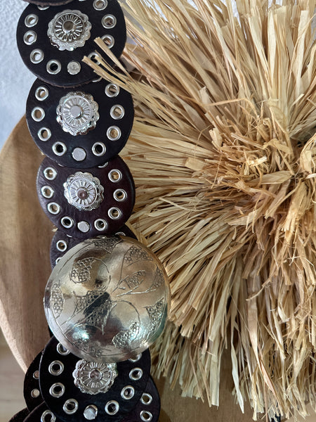 Cinto em pele em círculos, com tachas e aplicações em prateado, fivela com gancho