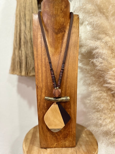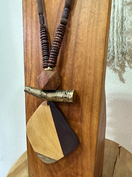 Colar ajustável em cordão acolchoado, com pendente em madeira pintada e detalhes em acrílico e em dourado