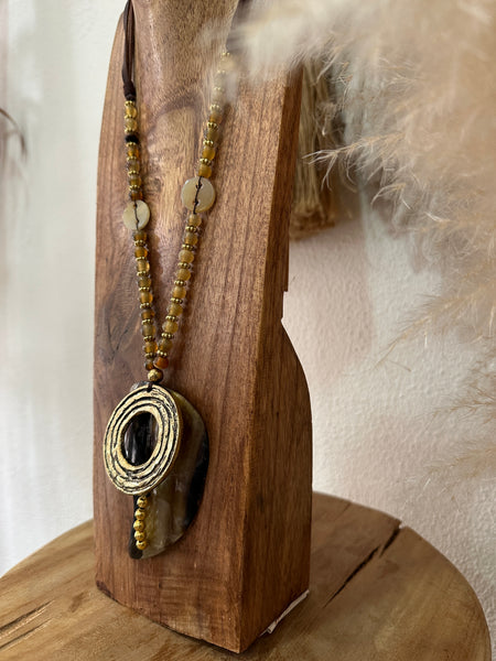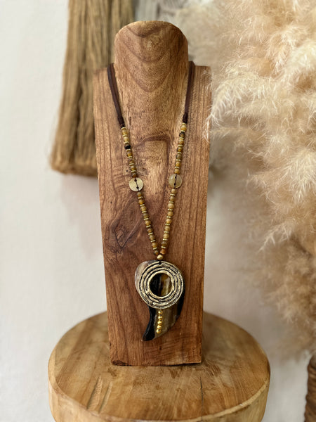 Colar ajustável em cordão de pele, medalhão em osso e detalhes em dourado