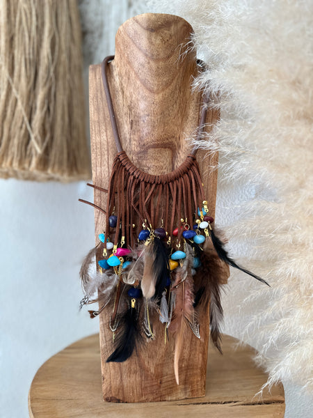 Colar curto em ecopele com penas e detalhes em acrílico, corrente de ajuste e fecho lagosta
