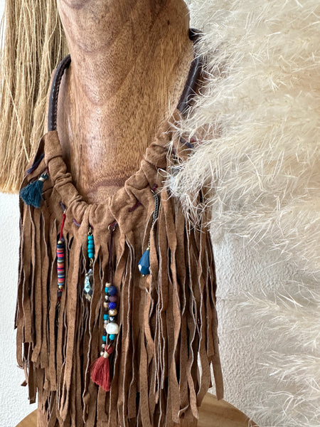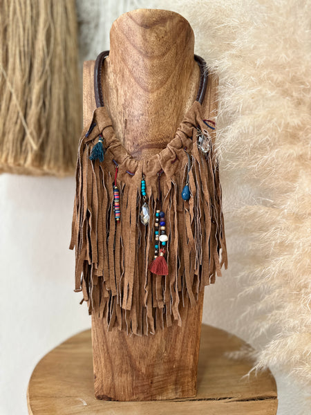 Colar curto em ecopele e camurça, com detalhes coloridos, corrente de ajuste e fecho lagosta