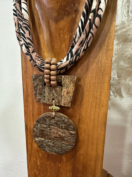 Colar em cordão acolchoado em animal print, com pendente em madeira e detalhes em dourado, fecho em botão tipo bola