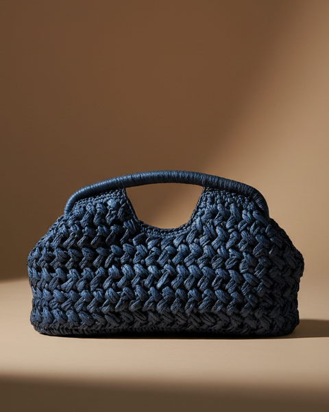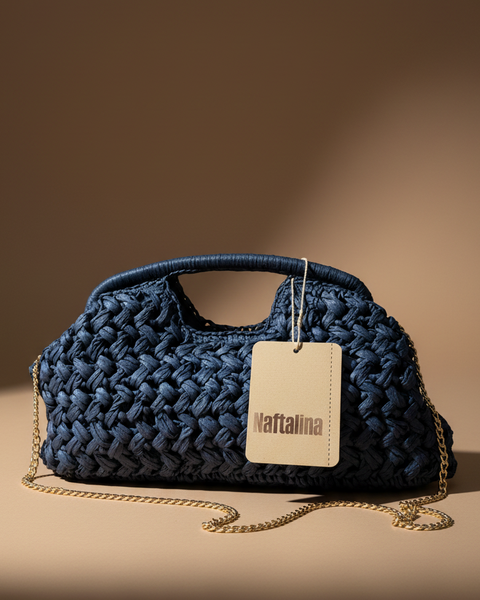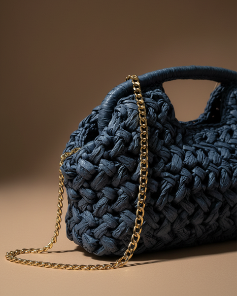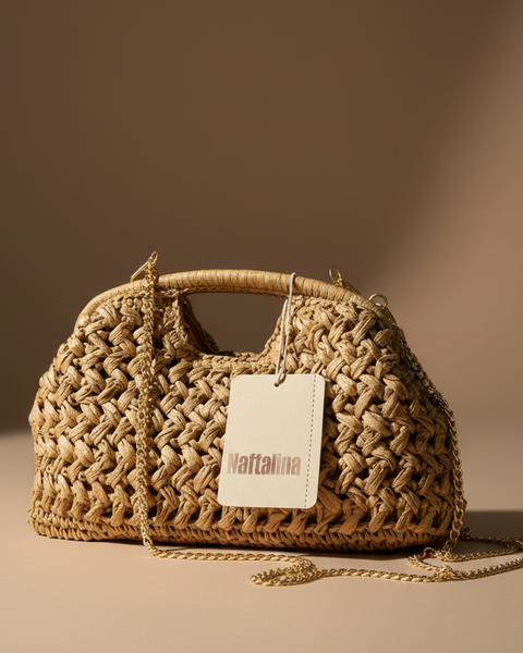 Elegante clutch em tecido trançado artesanal com alça estruturada e corrente dourada removível. Design sofisticado que combina textura natural com acabamentos premium em metal dourado. Com forro interior e fecho com mola.