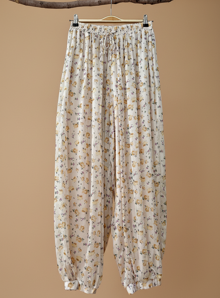 Calças KENZI estilo bombacha em tecido fluido com estampado floral delicado em tons amarelo e lilás. Forradas. Cintura elástica ajustável e tornozelos franzidos. Corte amplo e confortável de inspiração boho.