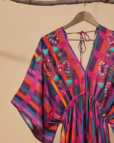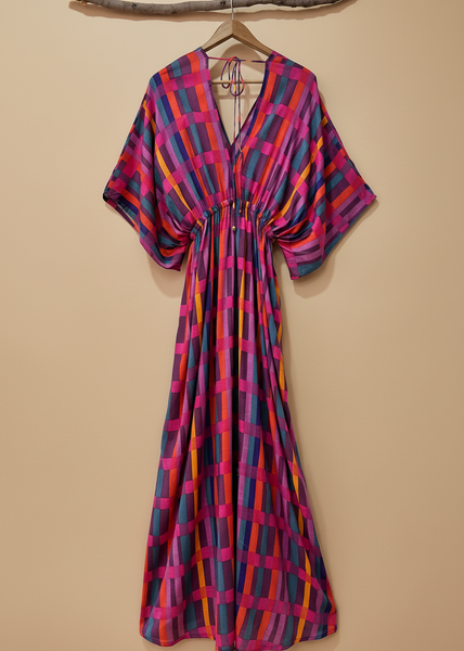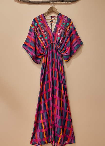 Vestido maxi em viscose fluida com padrão de riscas multicolor vibrantes em tons de rosa, roxo, vermelho, laranja e azul. Destaque para os bordados artesanais com missangas formando corações e flores em tons de turquesa, rosa e laranja distribuídos pelo decote. Decote em V com fecho de atar, mangas morcego amplas e cintura elástica franzida para máximo conforto. Corte fluido e romântico, perfeito para um look boho-chic cheio de cor e movimento.