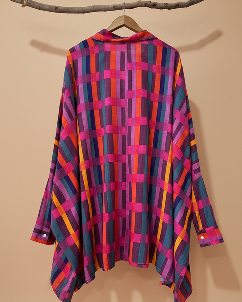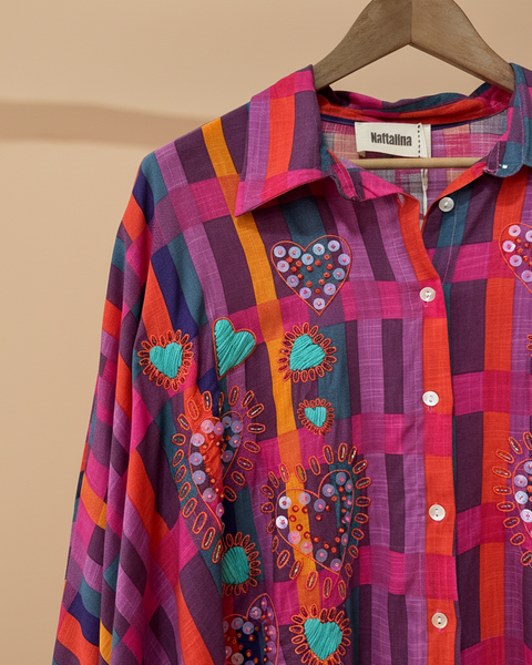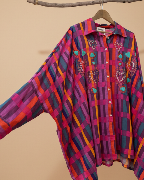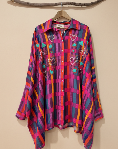 Túnica oversize em viscose fluida com padrão de riscas multicolor vibrantes em tons de rosa, roxo, vermelho, laranja e azul. Destaque para os bordados artesanais com missangas formando corações e flores em tons de turquesa, rosa e laranja. Gola clássica, fecho de botões frontal e barra assimétrica. Corte amplo e fluido, perfeita para usar como vestido ou túnica num look boho-chic cheio de cor.