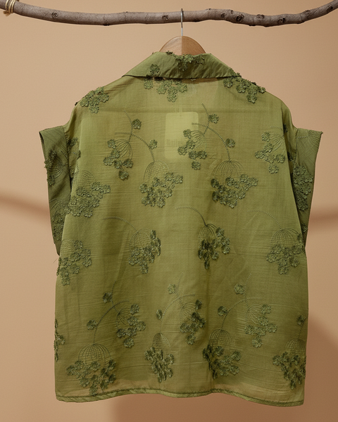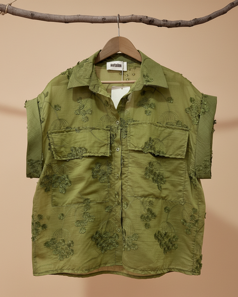 Camisa oversized em tecido leve semi-transparente verde oliva, coberta de bordados tonais e flores — sofisticada, discreta e cheia de personalidade. Dois bolsos frontais e mangas curtas com acabamento raw edge.